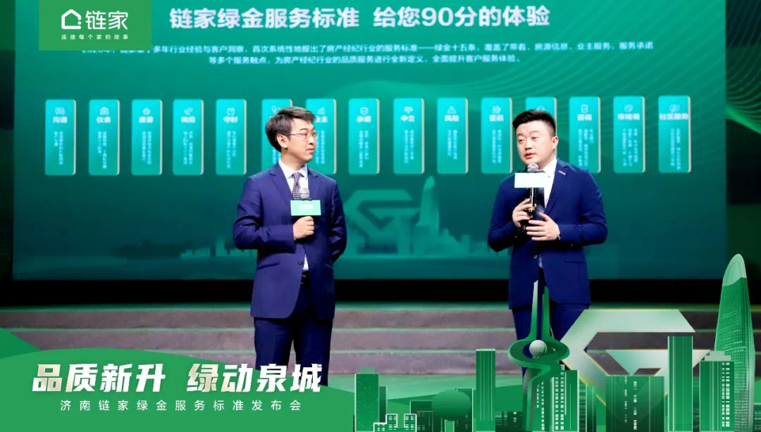 会上,链家全国品牌负责人蔡涛及济南链家总经理徐启锋,共同揭晓了链家绿金服务标准内容,见证了服务品质再升级。