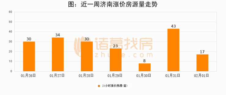 根据诸葛找房数据显示,济南24小时涨价房源量为17套,较01月31日减少26套,环比下降60.5%。与此同时,涨价房源占比小幅回落,对于购房者来说是一个入市窗口期,购房者可抓住时机入市。
