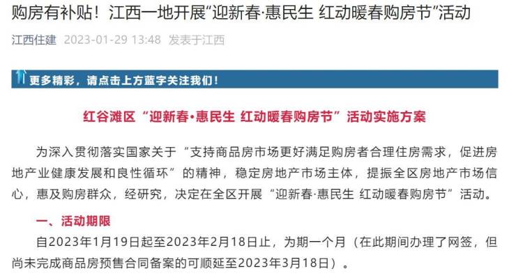 1月29日,“江西住建”微信公众号发文称,江西一地开展“迎新春·惠民生 红动暖春购房节”活动。