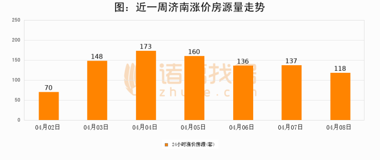 根据诸葛找房数据显示,济南24小时涨价房源量为118套,较04月07日减少19套,环比下降13.9%。与此同时,涨价房源占比小幅回落,对于购房者来说是一个入市窗口期,购房者可抓住时机入市。