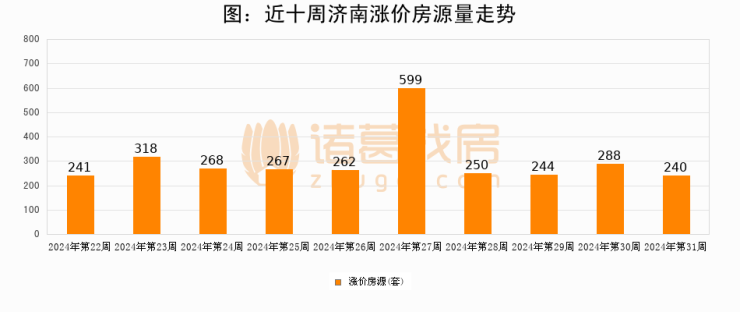 从调价房源来看,第31周济南涨价房源240套,较上周下降16.7%。与此同时,31周涨价房源占比提升1.18个百分点,业主信心持续恢复。