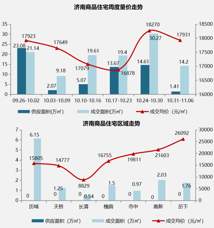 10月31日-11月6日,济南商品住宅成交14.2万㎡,环比下降53.09%,成交均价17931元/㎡;10个项目开盘加推;土地市场无新增供应,新增24宗土地成交。