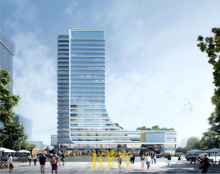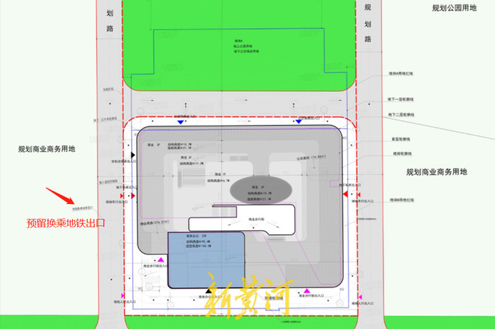 站在项目南侧北看,建筑主体和裙楼呈“L”形。项目方案显示,地块A地上为公园用地,地下为公交场站;地块B裙楼为商业,设计有商业步行街,商务办公部分建筑主体结构高度95.4米,造型高度103.3米,地上共25层。