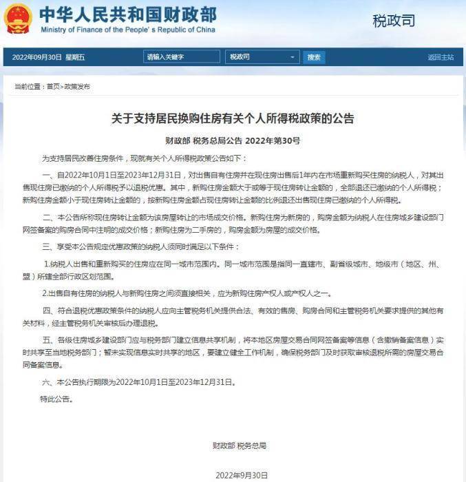 财政部、税务总局30日发布《关于支持居民换购住房有关个人所得税政策的公告》。
