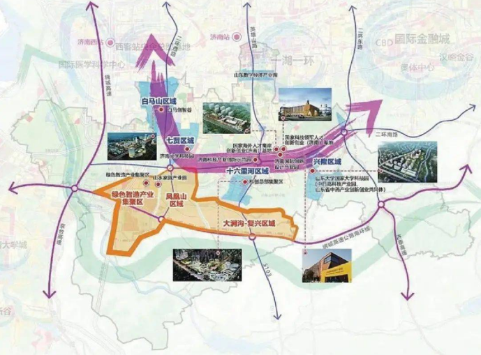 是市中区结合省、市相关规划要求,规划“一带一城”,建设二环南科创带和南部科创新城。“一带”即以二环南路为轴线,构筑集科创平台打造、科创企业培育、科创人才合作、科创项目扶持、科创成果转化于一体的二环路科创产业带。在这一轴带上,将集聚山东大学国家大学科技园、中日高科技产业园(iTOT)、科创总部集聚区、济南国际创新设计产业园、白马创智谷等一批重大产业园区,未来将实现爆发式成长与发展。