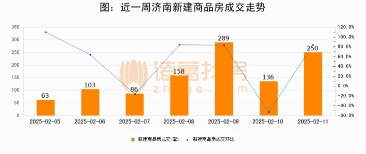 根据济南市住房和城乡建设局数据显示,2025年02月11日济南新建商品房成交250套,较昨日增加114套,环比上涨83.8%