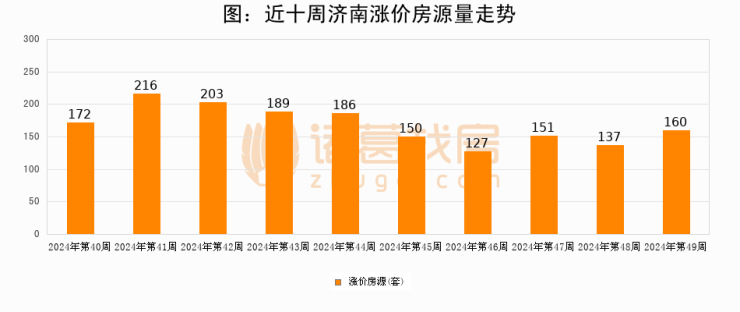 从调价房源来看,第49周济南涨价房源160套,较上周上涨16.8%。与此同时,49周涨价房源占比提升1.47个百分点,业主信心持续恢复。