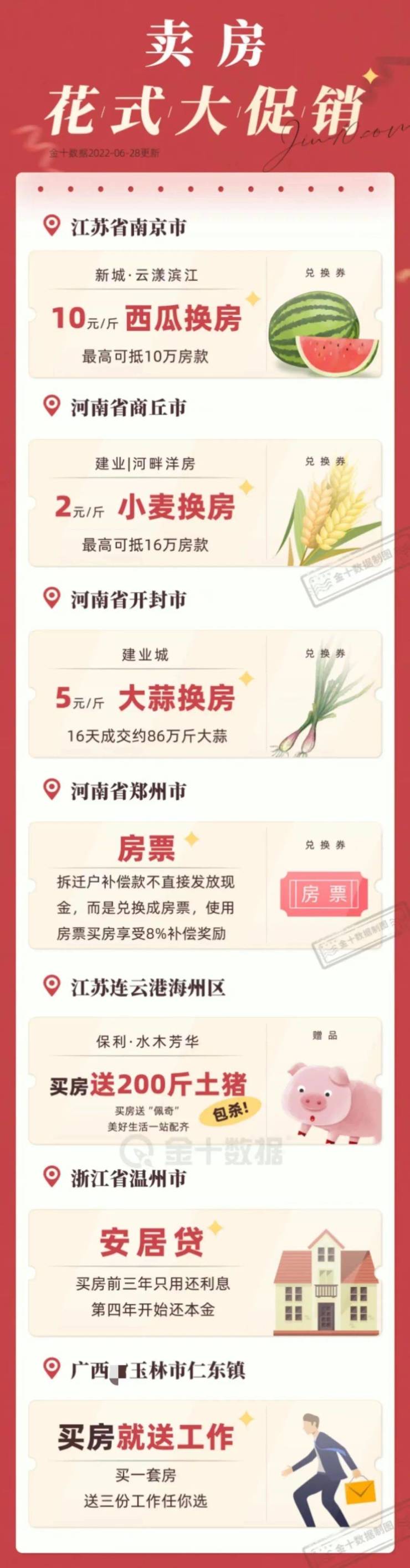 建业地产在河南开封杞县还推出了大蒜抵房款。据了解,十多天里,建业城凭借大蒜换房政策,成功卖出了30套房,换来了86万斤大蒜。江苏连云港(601008)海州区保利的一个楼盘,近日推出活动,买房送一只200斤的土猪。广西玉林市仁东镇,为了今年一解毕业生找工作之所忧,推出了买一套房,当地城市管理局负责向进城购房且未就业的新市民推荐3个以上就业岗位,且薪酬不低于玉林较低工资标准的政策,政策2022年全年有效。