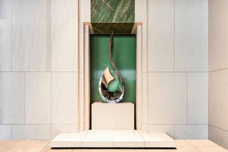 在展示区入口,以「青绿」奢石作为水景底座,搭配松之气韵,风雅不彰自显;下沉庭院水景幕墙,采用产自安德拉的「黑金沙」奢石,嵌入一块超45㎡、造价超百万的「青绿」奢石,更显尊崇;阶梯处以奢石+琉璃的组合,质感和谐,更添了几分艺术格调。