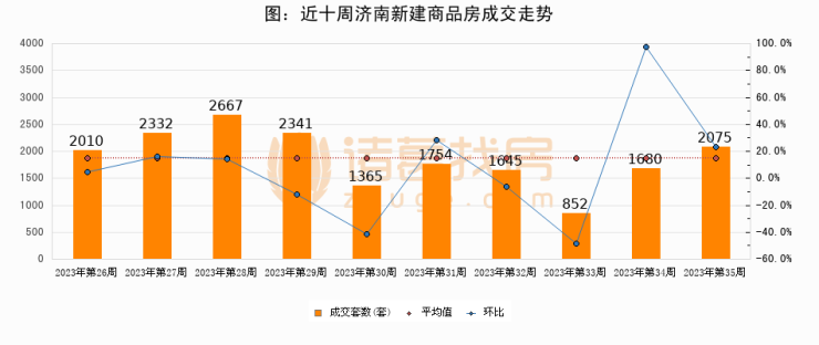 进入2023年第35周(08月21日-08月27日),济南新建商品房成交2075套,较上周增加395套,环比上涨23.5%