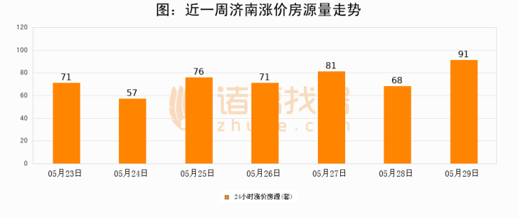 根据诸葛找房数据显示,济南24小时涨价房源量为91套,较05月28日增加23套,环比上涨33.8%。与此同时,涨价房源占比小幅扩大,业主信心有所提升。