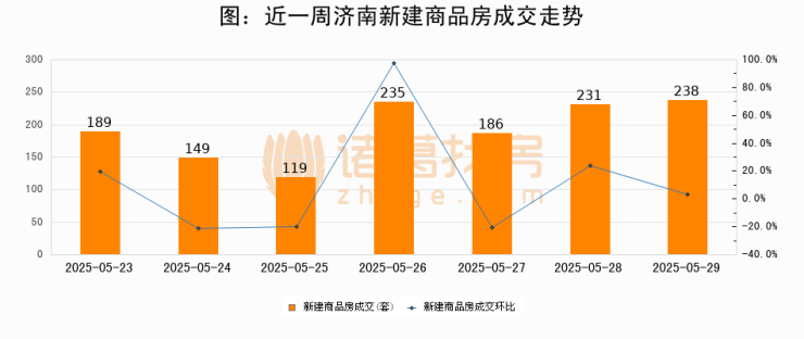根据济南市住房和城乡建设局数据显示,2025年05月29日济南新建商品房成交238套,较昨日增加7套,环比上涨3%