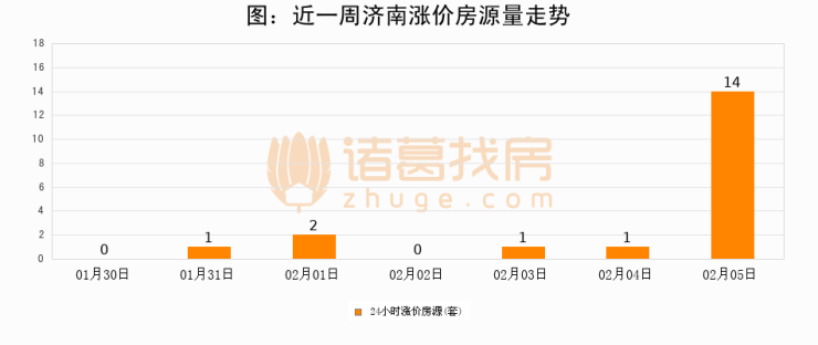 根据诸葛找房数据显示,济南24小时涨价房源量为14套,较02月04日增加13套,环比上涨1300%。与此同时,涨价房源占比小幅扩大,业主信心有所提升。