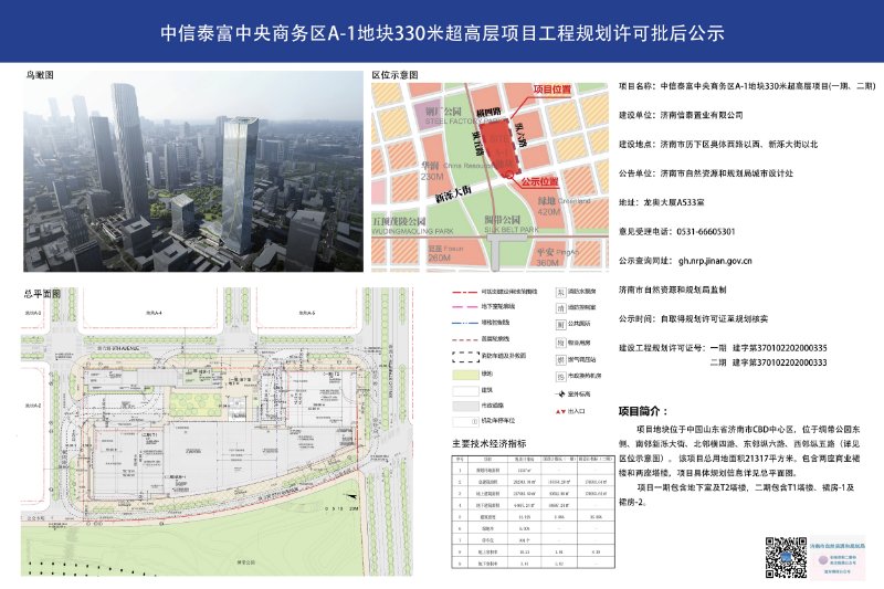 近日,记者从济南市自然资源和规划局了解到,中信泰富中央商务区A-1地块330米超高层项目工程规划许可批后公示公布。项目地块位于国际金融城中心区,位于绸带公园东侧、南邻新泺大街、北邻横四路、东邻纵六路、西邻纵五路。 公示中显示,项目总用地面积21317平方米,总建筑面积282343.84平方米,地上建