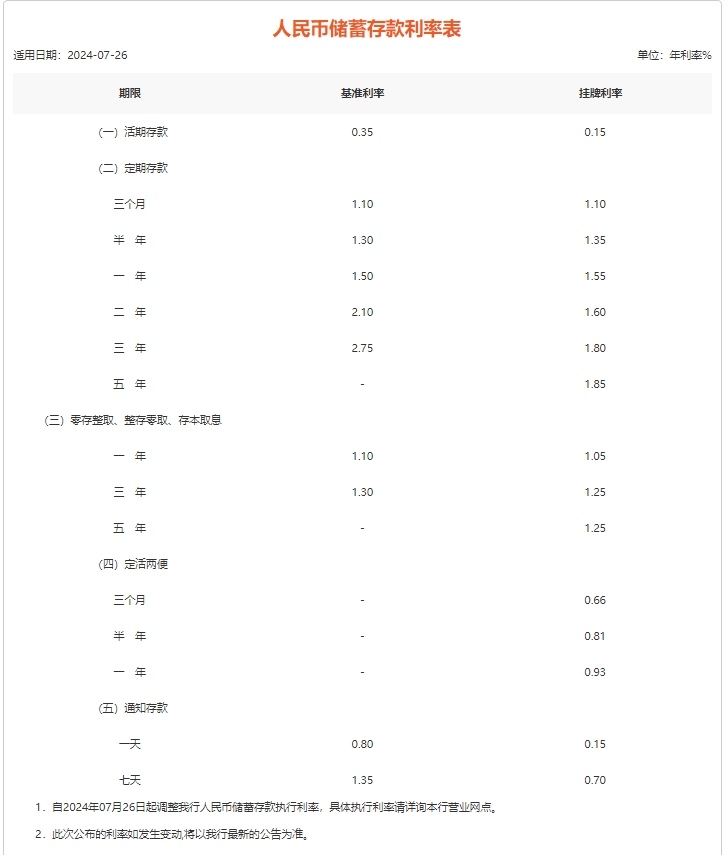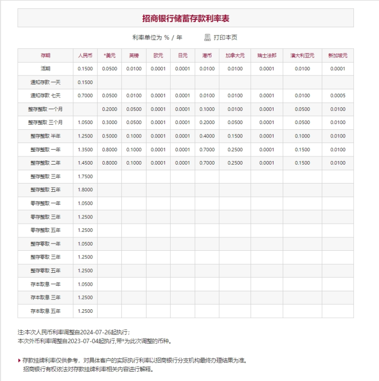 具体来看,招商银行调整后的人民币存款挂牌利率与六大银行保持一致。活期存款年利率由0.20%调整为0.15%,下调5个基点;整存整取定期存款三个月、六个月、一年期由1.15%、1.35%、1.45%调整为1.05%、1.25%、1.35%,均下调10个基点;二年、三年、五年期由1.65%、1.95%、2.00%调整为1.45%、1.75%、1.80%,均下调20个基点。