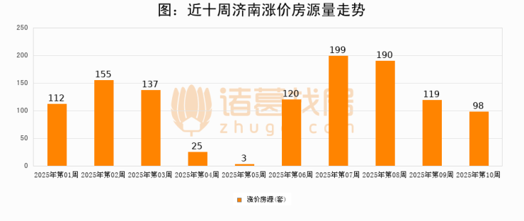 从调价房源来看,第10周济南涨价房源98套,较上周下降17.6%。与此同时,10周涨价房源占比回落1.53个百分点,业主信心小幅波动,购房者可则需入市。