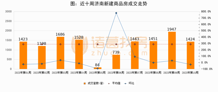 进入2025年第10周(03月03日-03月09日),济南新建商品房成交1424套,较上周减少523套,环比下降26.9%。从近十周成交来看,周均成交套数为1292套,本周成交1424套,高于近十周平均成交量10.2%。