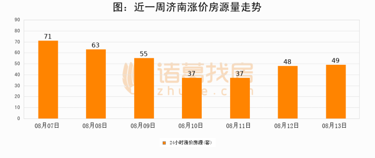根据诸葛找房数据显示,济南24小时涨价房源量为49套,较08月12日增加1套,环比上涨2.1%。与此同时,涨价房源占比小幅扩大,业主信心有所提升。