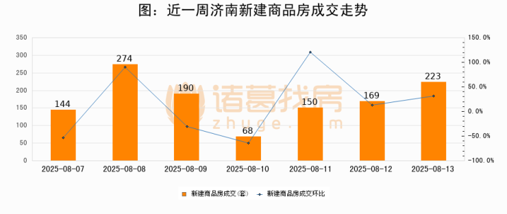 根据济南市住房和城乡建设局数据显示,2025年08月13日济南新建商品房成交223套,较昨日增加54套,环比上涨31.9%