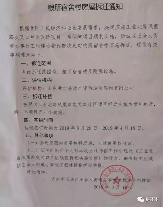 这份济南市历城区王舍人街道办事处工程建设指挥部3月19日签发的《粮所宿舍楼房屋拆迁通知》文件显示,本次拆迁范围为粮所宿舍楼及附属设施;拆迁补偿按照《工业北路凤凰路交叉口片区项目拆迁实施方案》执行,同一个项目同一个政策;协议签订时间为2019年3月30日-2019年4月18日。