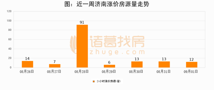 根据诸葛找房数据显示,济南24小时涨价房源量为12套,较08月31日减少1套,环比下降7.7%。与此同时,涨价房源占比小幅回落,对于购房者来说是一个入市窗口期,购房者可抓住时机入市。