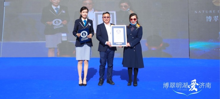 在吉尼斯世界纪录认证官及监督员的确认下,博翠明湖成功挑战吉尼斯世界纪录!吉尼斯认证官为博翠明湖颁发了吉尼斯证书。
