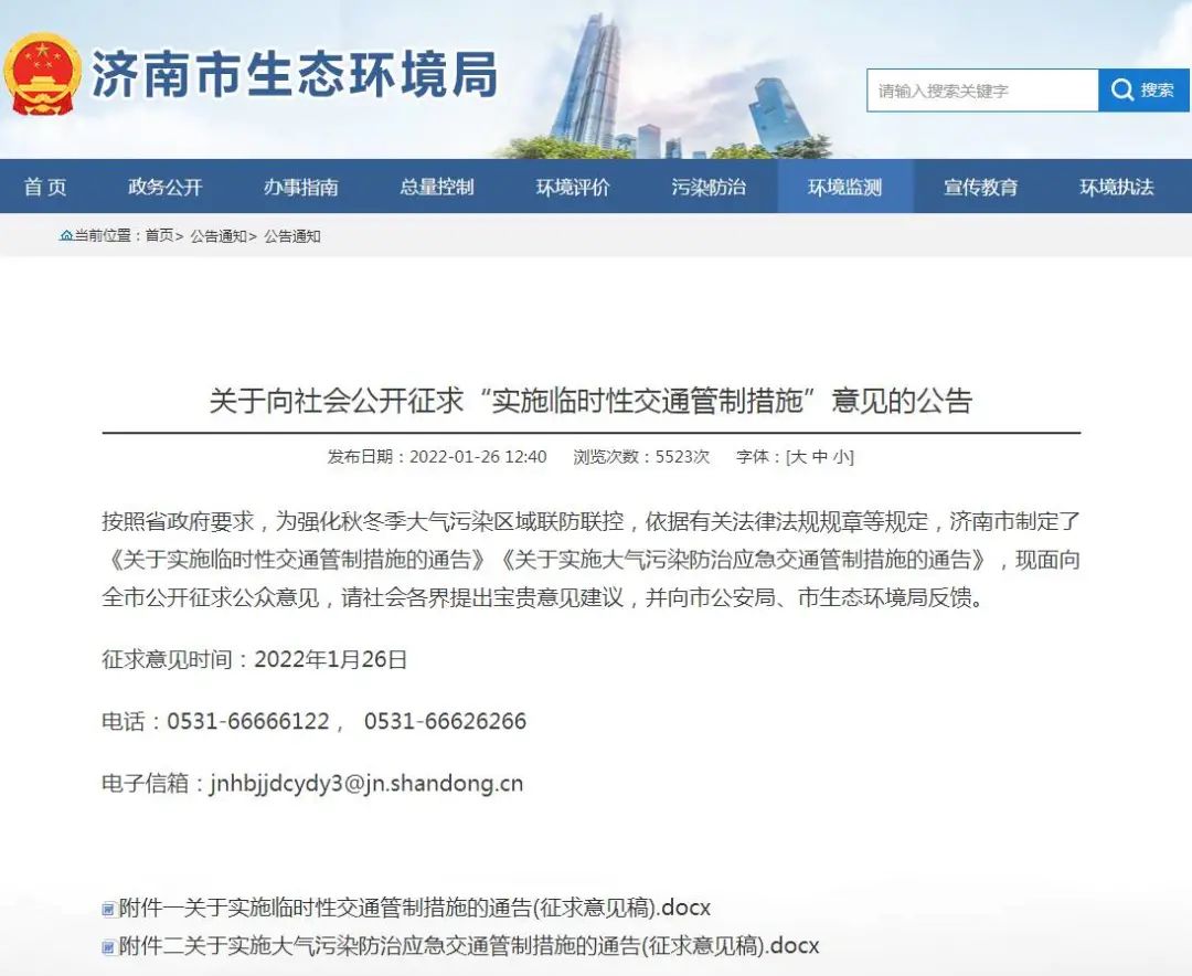 按照省政府要求,为强化秋冬季大气污染区域联防联控,依据有关法律法规规章等规定,济南市制定了《关于实施临时性交通管制措施的通告》《关于实施大气污染防治应急交通管制措施的通告》,现面向全市公开征求公众意见,请社会各界提出宝贵意见建议,并向市公安局、市生态环境局反馈。