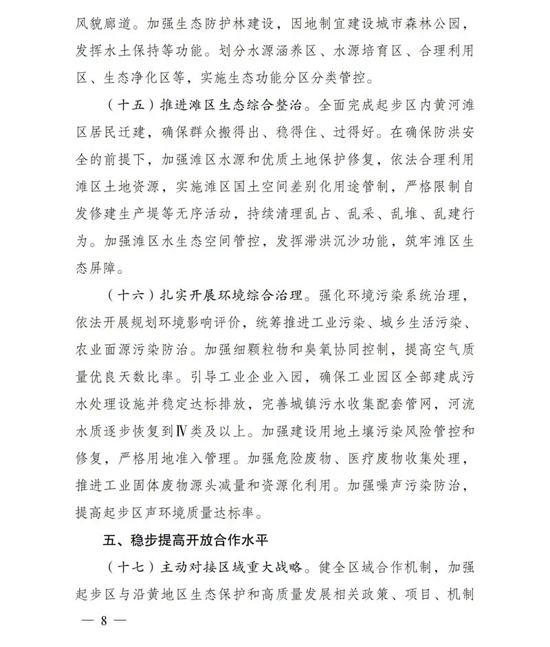 《实施方案》明确了起步区建设的重点任务。一是着力增强发展新动能,提升科技创新支撑能力,加快发展战略性新兴产业和先进制造业,培育壮大现代服务业,充分挖掘黄河文化时代价值。二是探索创新城市发展方式,积极推动节水型城区建设,大力促进城区绿色低碳发展,加快建设智慧城市,高标准布局交通基础设施网络。三是全面提升生态环境质量,保护修复自然生态系统,加快建设绿色生态廊道,推进滩区生态综合整治,扎实开展环境综合治理。四是稳步提高开放合作水平,主动对接区域重大战略,积极拓展国际合作空间。