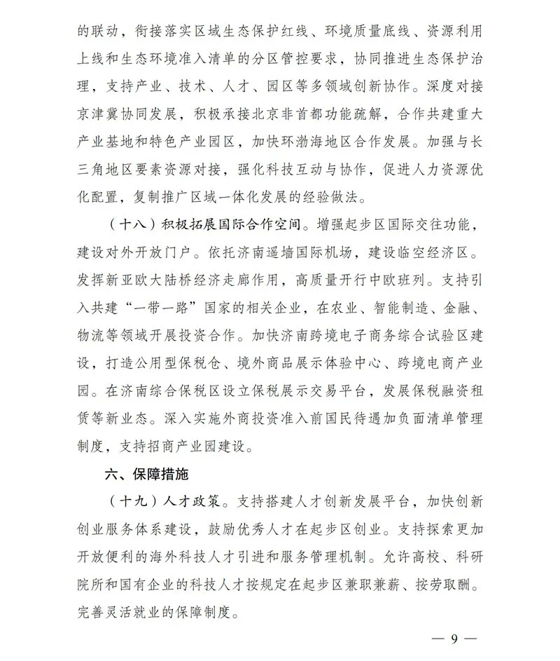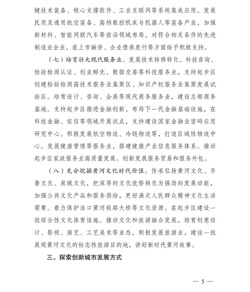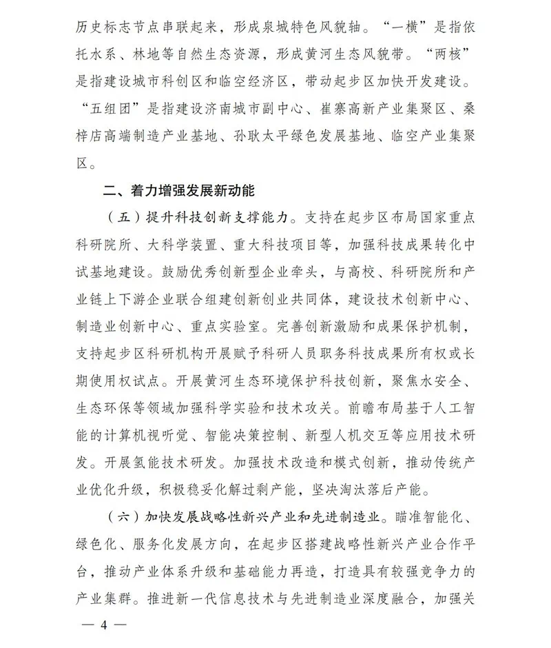 《实施方案》提出,支持济南建设新旧动能转换起步区,有利于推动山东半岛城市群高质量发展,形成黄河流域生态保护和高质量发展的新示范;有利于加快传统产业改造升级、培育壮大高新技术产业,形成山东新旧动能转换综合试验区的新引擎;有利于吸引集聚优质要素资源,形成高水平开放合作的新平台;有利于探索量水而行、节水为重的城市发展方式,形成绿色智慧宜居的新城区。
