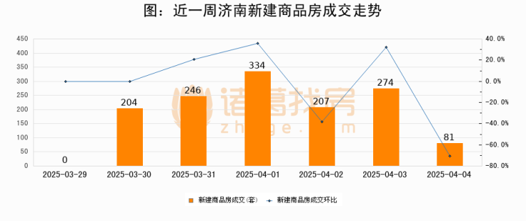 根据济南市住房和城乡建设局数据显示,2025年04月04日济南新建商品房成交81套,较昨日减少193套,环比下降70.4%