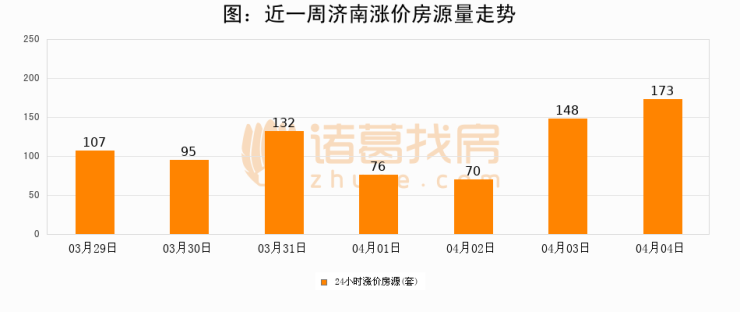 根据诸葛找房数据显示,济南24小时涨价房源量为173套,较04月03日增加25套,环比上涨16.9%。与此同时,涨价房源占比小幅扩大,业主信心有所提升。