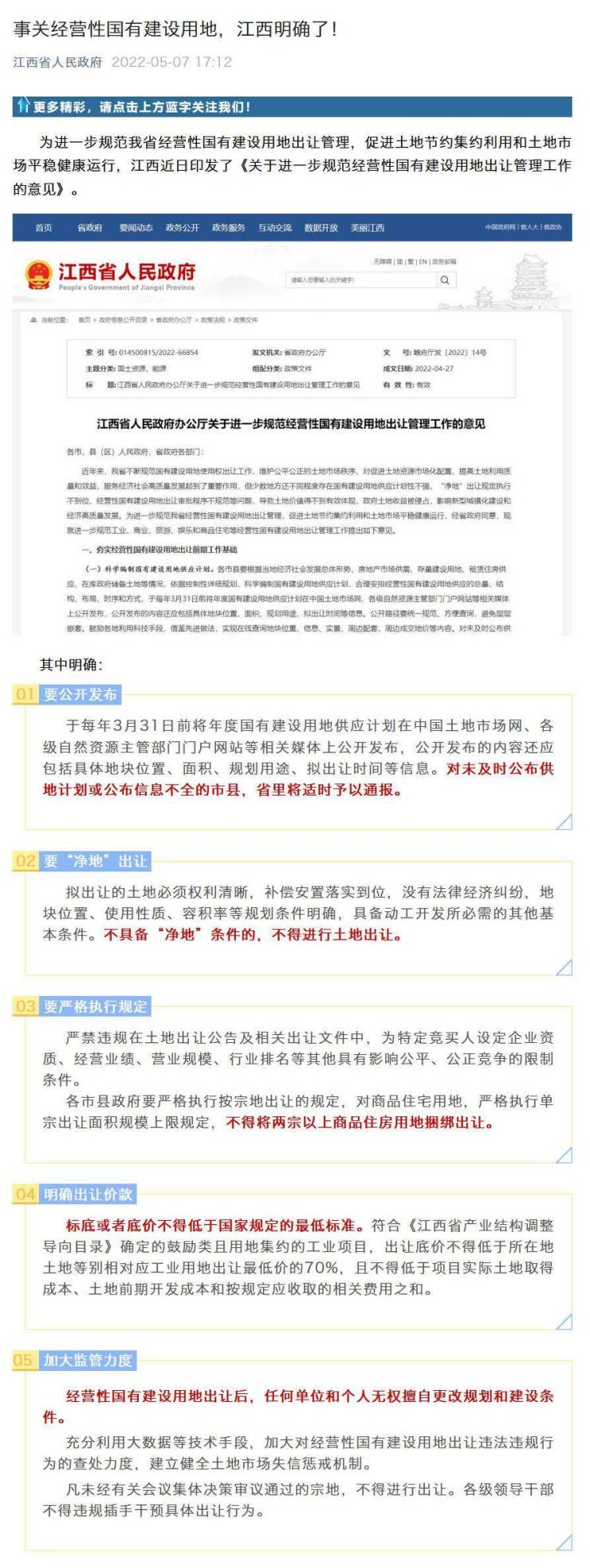 5月7日,据江西省人民政府官微消息,为进一步规范经营性国有建设用地出让管理,促进土地节约集约利用和土地市场平稳健康运行,江西近日印发《关于进一步规范经营性国有建设用地出让管理工作的意见》。