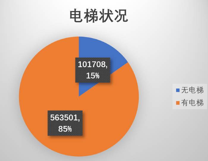 绝大多数交易样本具有电梯。在交易样本中,有电梯的样本数为563501,占比为85%,无电梯的样本数为101708,占比15%。