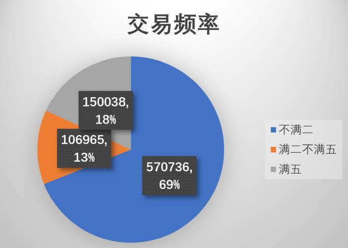 大多数二手房交易的持有时间不满2年。在二手房交易样本中,不满二年的比例为69%,满二年不满五年的比例为13%,满五年以上为18%。