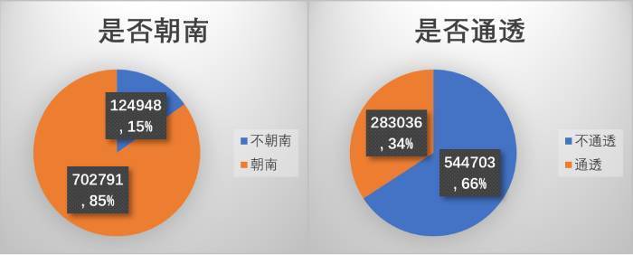 住房总体光照条件较好,绝大多数户型均朝南。分析的二手房交易样本中,朝南的样本数为702791,占总数的85%,不朝南的样本数为124948, 占样本总数的15%。