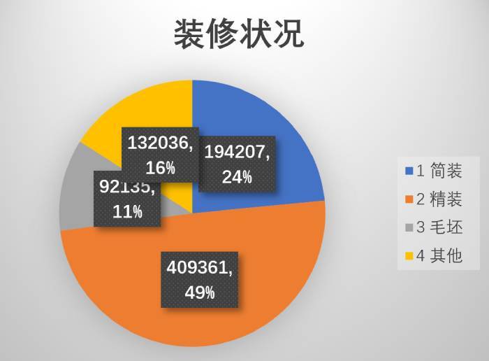 二手房交易中,装修房比例较高。样本中,精装修房的比例为49%,简装房的比例为24%,二者合计为73%,占了交易房源的绝大比例。