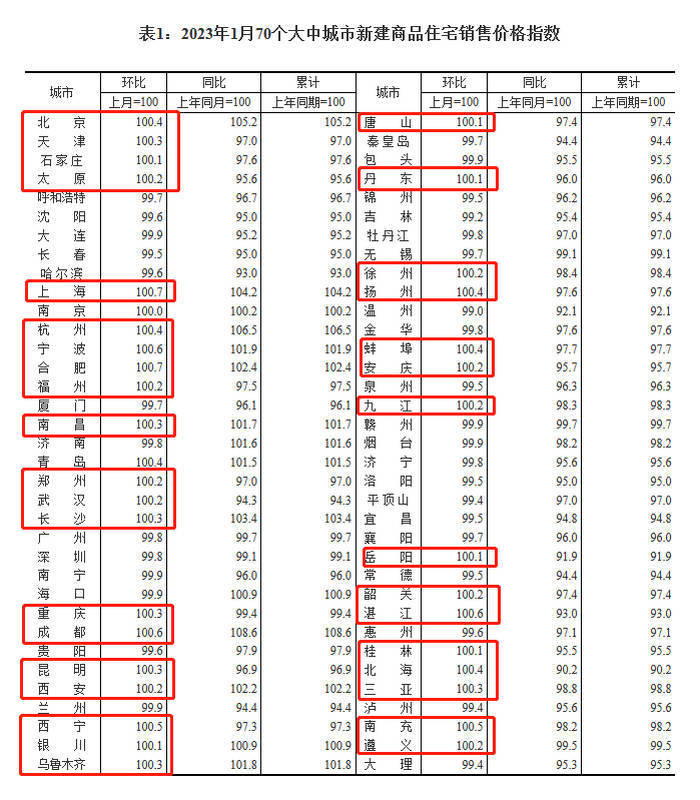 2023年1月份,70个大中城市中商品住宅销售价格环比上涨城市个数增加;一线城市商品住宅销售价格环比转涨、二三线城市环比降势趋缓,一线城市商品住宅销售价格同比上涨、二三线城市同比下降。