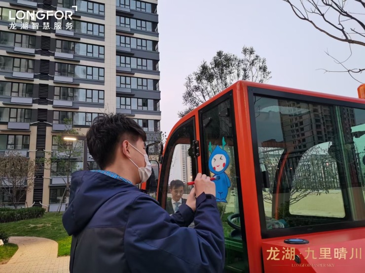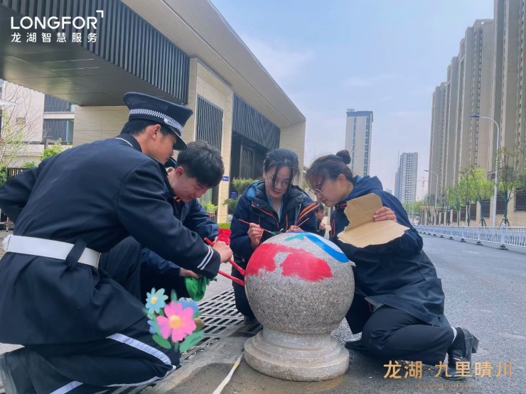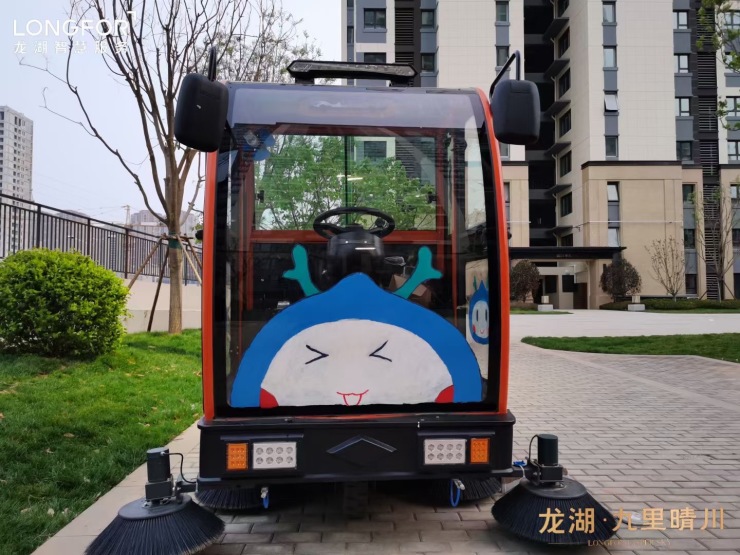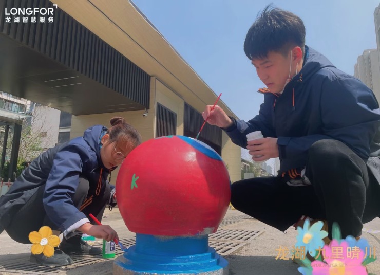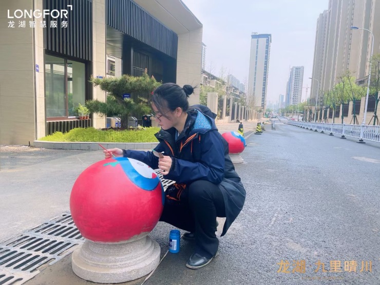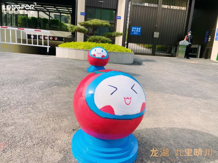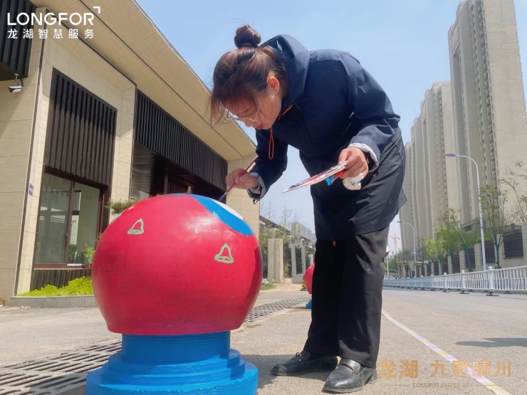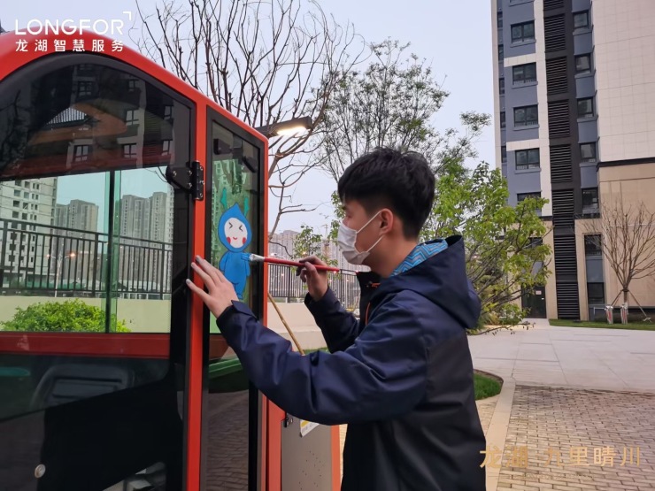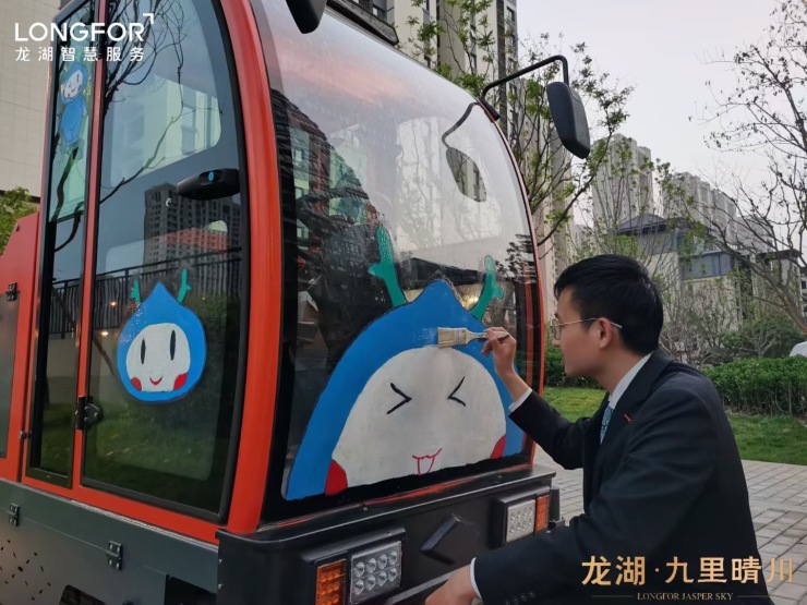 这些萌趣龙小湖,都是济南龙湖智慧服务的管家与秩序小伙伴共同描绘的,大家手持画笔一展艺术天赋,拿着基础图样,调配好颜料,把社区的巡逻车、隔离墩都化成了首席亲善官——龙小湖的样子,用一份色彩,一份用心,为社区生活添彩。