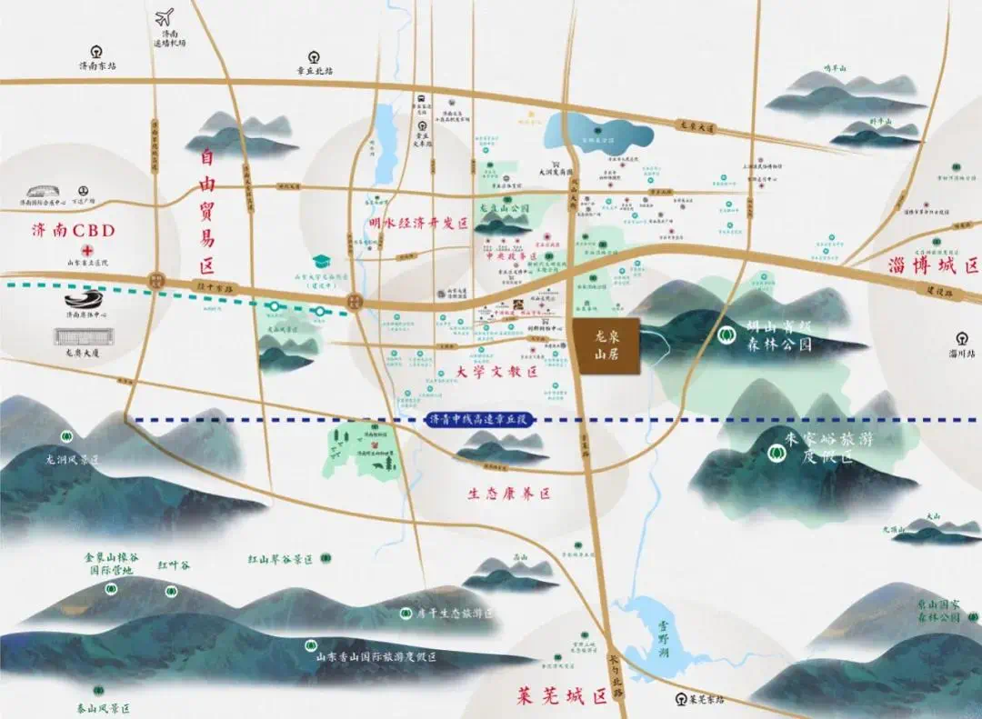 项目位于济南市章丘区核心区域,地处章丘大学城片区,人文气息浓厚,北侧紧邻360亩白泉湿地公园,东侧临近5000亩胡山省级森林公园。多维立体路网纵横交织,北距经十路约1.2公里,快速接驳济青中线高速,交通优势明显。社区规划二街六景六坊,打造多个主题空间,约1.0-1.1超低容积率,形成外有山景、内藏园境的低密生活。