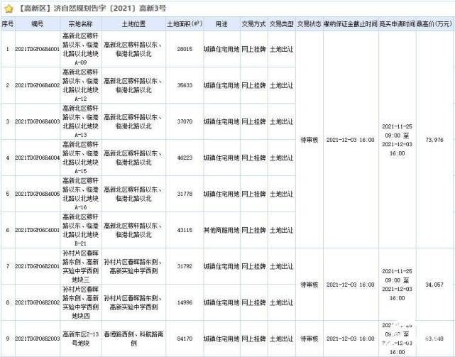 排名前列批高新区9宗土地全部以底价成交,进入审核阶段,土地面积共超过35万㎡。除高新北区稼轩路以东、临港北路以北地块B-21为其他商服用地外,其余均为城镇住宅用地。高新北区稼轩路以东、临港北路以北A-09、A-12、A-13、A-15、A-16、B-21地块为组团出让,根据前期挂牌文件,此处须建设不少于3000平方米的稼轩文旅城游客集散服务中心及稼轩文化展示展览馆、出资不低于5000万元对辛弃疾纪念馆进行整体提升改造以及引入1家具有运营高级进口贸易港资质的公司。