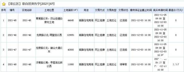 章丘区此次集中拍卖的4宗地中,济青路以南、枣园派出所以西的2021-48地块已成交,土地面积约11880平方米;2021-45、2021-46、2021-47三宗地遭流拍。