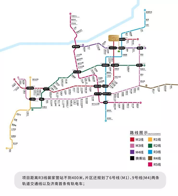 再看地铁。2019年,地铁R3线通车,万象东方距离裴家营站只有约400米;未来6#线、9#线在万象新天小区北侧的凤凰路响泉街路口交汇,设置换乘站王舍人北站,距离万象东方也只有约600米。在不久的将来,万象东方周边1km范围内有3条地铁线、2个地铁换乘站,地铁分布的密度在整个济南市都是数一数二的。
