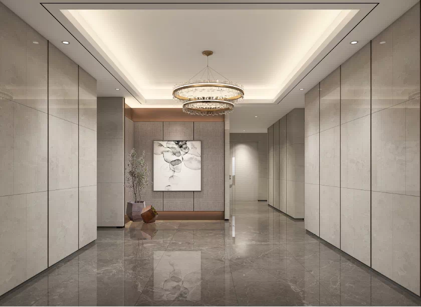 大家可以看下面两张图,是万象东方楼栋一层和地下车库一层的精装效果图;另外,万象东方负一层车库和地下大堂入口处,还设计了风格统一的亮化门头,这种装修标准,在济南已经能算得上豪宅的精装标准了,设计和用材相当考究,也符合万象东方宣传的新东方风格。