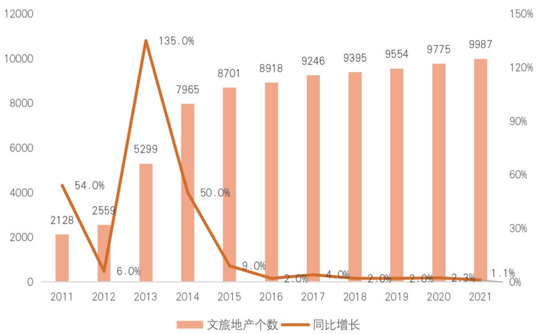 从市场格局来看,在文旅“去地产化”的趋势下,2021年全国新增文旅地产项目212个,同比仅增长1.1%。截至2021年底,全国文旅地产项目累计数量达9987个。