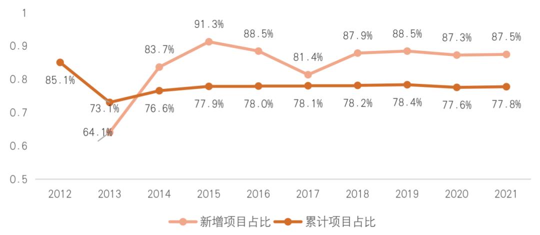 图2 2012-2021年新增与累计文旅地产项目数目(六大区域)占比全国情况