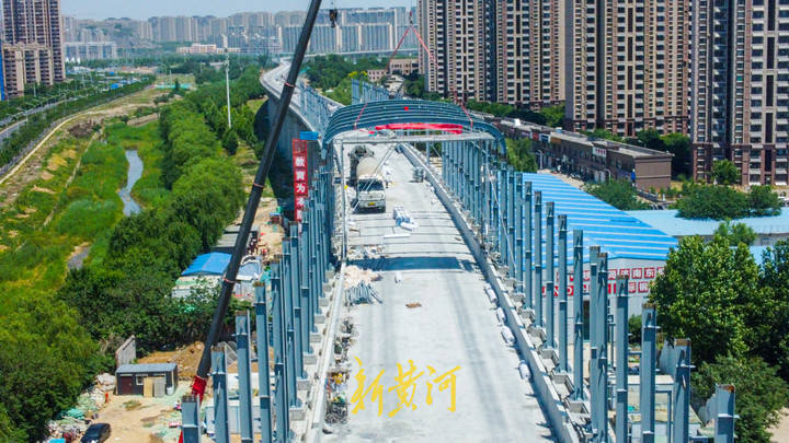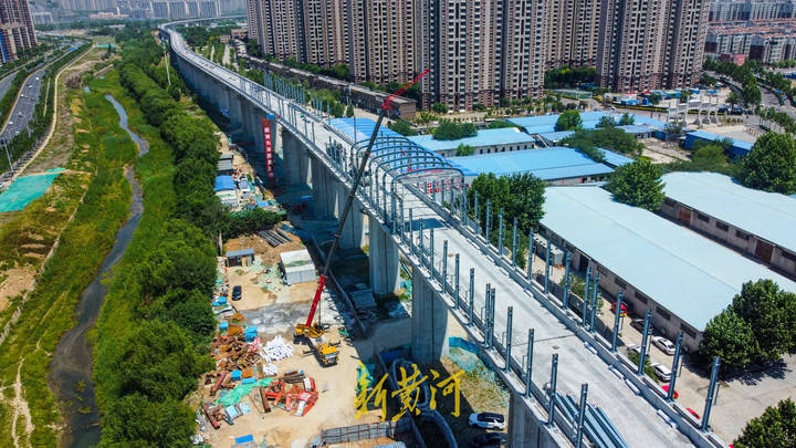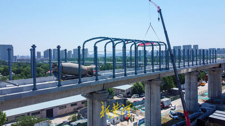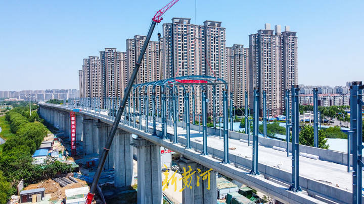 5月21日,在奥体西路与工业北路交叉口东侧的胶济铁路至济青高铁联络线工程建设现场,黄台联络线的跨工业北路高架桥主体已经建成,施工人员开始在工业北路以北的高架桥上方安装钢架结构,组成"n"形结构,再安装隔音挡板,组成封闭式空间的隔音屏障,高铁列车在此处穿行时如同在隧道中行驶一般。