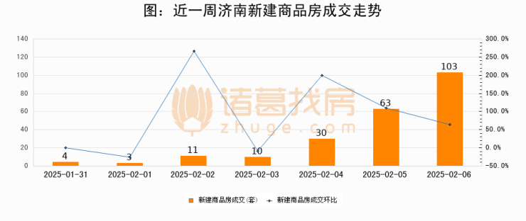 根据济南市住房和城乡建设局数据显示,2025年02月06日济南新建商品房成交103套,较昨日增加40套,环比上涨63.5%