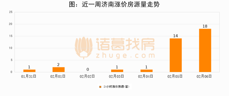 根据诸葛找房数据显示,济南24小时涨价房源量为18套,较02月05日增加4套,环比上涨28.6%。与此同时,涨价房源占比小幅扩大,业主信心有所提升。