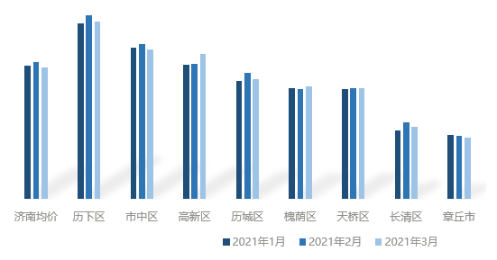二手房成交均价微幅下降。从近三个月数据来看,二手房成交均价有所下降,环比2021年2月降低3.84%,变化不大,处于相对平稳状态;分城区看,价格涨跌互现,其中高新区与天桥区实现连续上涨,高新区涨幅较高;章丘市实现连续下降,长清区跌幅较大。