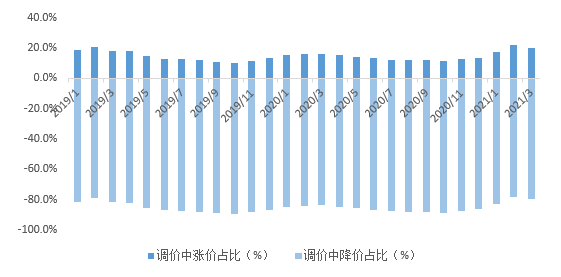 图:贝壳找房统计-济南二手房业主调价中涨、降价次数占比